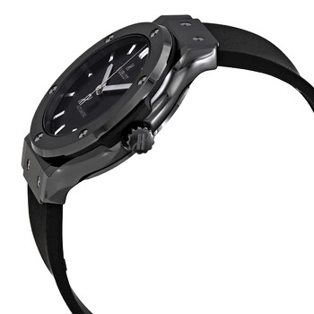 Black ceramic case with a black rubber strap. Fixed black ceramic bezel. Black dial with silver-tone hands and index hour markers. Dial Type: Analog. Date display at the 3 o'clock position. Hublot calibre HUB1110 automatic movement, based upon Sellita SW300-1, containing 21 Jewels, composed of 63 parts, bitting at 28800 vph, and has a power reserve of approximately 42 hours. Scratch resistant sapphire crystal. Pull / push crown. Transparent see through case back. Round case shape, case size: 38 mm. Push button fold over clasp. Water resistant at 50 meters / 150 feet. Functions: date, hour, minute, second. Classic Fusion Series. Luxury watch style. Watch label: Swiss Made. Hublot Classic Fusion Automatic Black Dial Watch 565.cm.1470.rx.