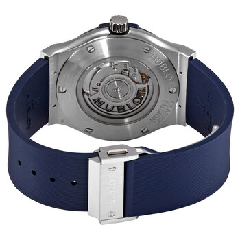 Grey titanium case with a blue rubber strap. Fixed grey titanium bezel. Blue dial with silver-tone hands and index hour markers. Dial Type: Analog. Date display at the 3 o'clock position. Hublot calibre HUB1112 automatic movement, based upon Sellita SW300-1, containing 25 Jewels, composed of 63 parts, bitting at 28800 vph, and has a power reserve of approximately 42 hours. Scratch resistant sapphire crystal. Transparent case back. Round case shape. Case size: 45 mm. Deployment clasp with a push button release. Water resistant at 50 meters / 165 feet. Functions: date, hour, minute, second. Additional Info: original box, manual (complete accessories). Classic Fusion Series. Luxury watch style. Watch label: Swiss Made. Hublot Classic Fusion Automatic Blue Dial Men's Watch 511.NX.7170.RX.