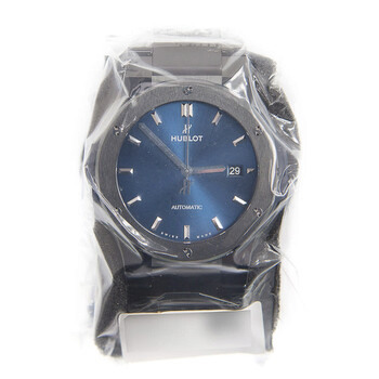 Black ceramic case and bracelet. Fixed black bezel. Blue dial with silver-tone hands and index hour markers. Dial Type: Analog. Date display at the 3 o'clock position. Hublot Calibre HUB1110 Automatic movement, based upon Sellita SW300-1, containing 21 Jewels, composed of 63 parts, bitting at 28800 vph, and has a power reserve of approximately 42 hours. Scratch resistant sapphire crystal. Pull / push crown. Transparent see through case back. Round case shape, case size: 42 mm. Push button folding clasp. Water resistant at 50 meters / 150 feet. Functions: date, hour, minute, second. Classic Fusion Series. Luxury watch style. Watch label: Swiss Made. Hublot Classic Fusion Automatic Blue Dial Men's Watch 548.CM.7170.CM.