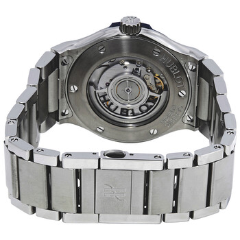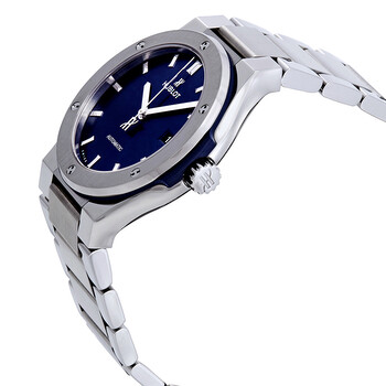 Grey titanium case with a grey titanium bracelet. Fixed grey titanium bezel. Blue dial with grey hands and index hour markers. Dial Type: Analog. Date display at the 3 o'clock position. Hublot calibre HUB1110 automatic movement, based upon Sellita SW300-1, containing 21 Jewels, composed of 63 parts, bitting at 28800 vph, and has a power reserve of approximately 42 hours. Scratch resistant sapphire crystal. Pull / push crown. Transparent case back. Round case shape. Case size: 42 mm. Band width: 21.5 mm / 25 mm. Fold over clasp with a push button release. Water resistant at 50 meters / 165 feet. Functions: date, hour, minute, second. Classic Fusion Series. Luxury watch style. Watch label: Swiss Made. Hublot Classic Fusion Automatic Blue Dial Men's Watch 548.NX.7170.NX.