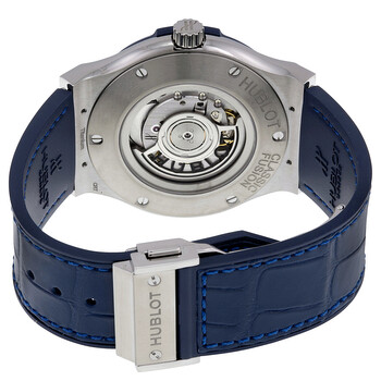 Grey (satin-finished) titanium case with a rubber (blue alligator leather inlay) strap. Fixed grey (satin-finished) titanium bezel. Blue sunray satin-finished dial with polished rhodium-plated hands and index hour markers. Dial Type: Analog. Date display at the 3 o'clock position. Hublot calibre HUB1112 automatic movement, based upon Sellita SW300-1, containing 25 Jewels, composed of 63 parts, bitting at 28800 vph, and has a power reserve of approximately 42 hours. Scratch resistant sapphire crystal. Pull / push crown. Skeleton case back. Round case shape. Case size: 45 mm. Case thickness: 10.5 mm. Band width: 20 mm. Deployment clasp. Water resistant at 50 meters / 165 feet. Functions: date, hour, minute, second. Classic Fusion Series. Luxury watch style. Watch label: Swiss Made. Item Variations: 511 NX 7170 LR, 511-NX-7170-LR, 511/NX/7170/LR, 511NX7170LR. Hublot Classic Fusion Automatic Blue Sunray Dial Titanium Men's Watch 511.NX.7170.LR.