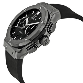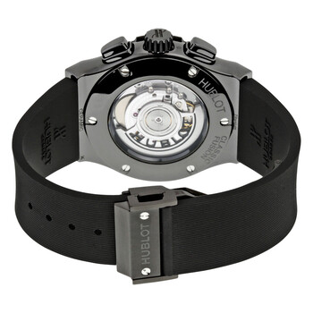 Black ceramic case with a black rubber strap. Fixed black ceramic bezel. Matt carbon fiber dial with silver-tone hands and index hour markers. Minute markers around the outer rim. Dial Type: Analog. Date display at the 6 o'clock position. Chronograph - two sub-dials displaying: 60 second and 30 minute. Hublot calibre HUB1143 automatic movement with a 42- hour power reserve. Scratch resistant sapphire crystal. Pull / push crown. Transparent case back. Case size: 45 mm. Round case shape. Deployment clasp with a push button release. Water resistant at 50 meters / 165 feet. Functions: chronograph, date, hour, minute, second. Luxury watch style. Watch label: Swiss Made. Hublot Classic Fusion Automatic Chronograph Black Magic Matt Carbon Fiber Dial Black Rubber Men's Watch 521.CM.1771.RX.
