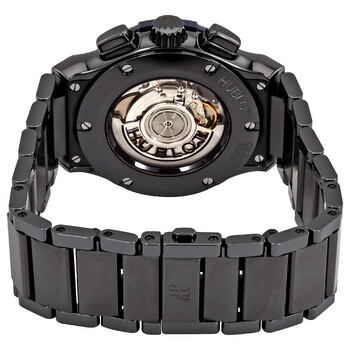 Black ceramic case with a black ceramic bracelet. Fixed black ceramic bezel. Blue sunray dial with rhodium-plated hands and index hour markers. Minute markers around the outer rim. Dial Type: Analog. Date display at the 6 o'clock position. Chronograph - two sub-dials displaying: 60 second and 30 minute. Hublot calibre HUB1143 automatic movement, based upon ETA 2892-A2, containing 59 Jewels, bitting at 28800 vph, and has a power reserve of approximately 42 hours. Scratch resistant sapphire crystal. Transparent case back. Round case shape. Case size: 45 mm. Fold over clasp with a push button release. Water resistant at 50 meters / 165 feet. Functions: chronograph, date, hour, minute, second. Classic Fusion Series. Luxury watch style. Watch label: Swiss Made. Hublot Classic Fusion Automatic Chronograph Blue Dial Men's Watch 520.CM.7170.CM.