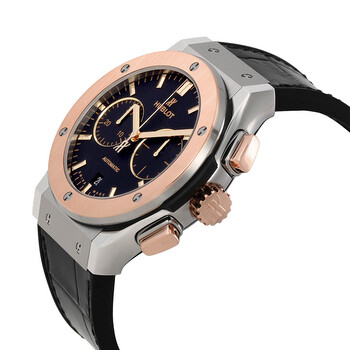Grey titanium case with a black rubber strap with a stiched black (alligator) leather top. Fixed 18kt king gold bezel. Mat black dial with rose gold-tone hands and index hour markers. Minute markers around the outer rim. Dial Type: Analog. Date display at the 6 o'clock position. Chronograph - two sub-dials displaying: 60 seconds, 30 minute. Hublot calibre HUB1143 automatic movement, based upon ETA 2892-A2, containing 59 Jewels, bitting at 28800 vph, and has a power reserve of approximately 42 hours. Scratch resistant sapphire crystal. Pull / push crown. Transparent case back. Round case shape. Case size: 45 mm. Band width: 20 mm. Fold over clasp. Water resistant at 50 meters / 165 feet. Functions: chronograph, date, hour, minute, second. Classic Fusion Series. Luxury watch style. Watch label: Swiss Made. Hublot Classic Fusion Automatic Chronograph Men's Watch 521.NO.1181.LR.
