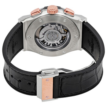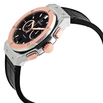 Titanium case with a black alligator leather strap (rubber lined). Fixed 18kt rose gold bezel. Mat black dial with rose gold-tone hands and index hour markers. Minute markers around the outer rim. Dial Type: Analog. Date display at the 6 o'clock position. Chronograph - two sub-dials displaying: 60 second and 30 minute. Hublot calibre HUB1153 automatic movement with a 42-hour power reserve. Scratch resistant sapphire crystal. Pull / push crown. Transparent case back. Case size: 42 mm. Round case shape. Deployment clasp with a push button release. Water resistant at 50 meters / 165 feet. Functions: chronograph, date, hour, minute, second. Luxury watch style. Watch label: Swiss Made. Hublot Classic Fusion Automatic Chronograph Men's Watch 541.NO.1181.LR.