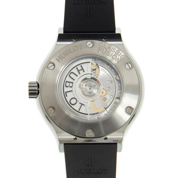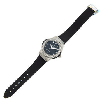 Grey titanium case with a black rubber strap. Fixed grey titanium bezel set with 36 diamonds (0.75ct). Black composite resin bezel lug sandwiched between the bezel and case. Black dial with silver-tone hands and index hour markers. Dial Type: Analog. Date display at the 3 o'clock position. Hublot calibre HUB1120 automatic movement, containing 18 Jewels, composed of 65 parts, bitting at 28800 vph, and has a power reserve of approximately 40 hours. Scratch resistant sapphire crystal. Pull / push crown. Transparent case back. Round case shape. Case size: 33 mm. Deployment clasp with a push button release. Water resistant at 50 meters / 165 feet. Functions: date, hour, minute, second. Classic Fusion Series. Luxury watch style. Watch label: Swiss Made. Hublot Classic Fusion Automatic Diamond Ladies Watch 582.NX.1170.RX.1204.