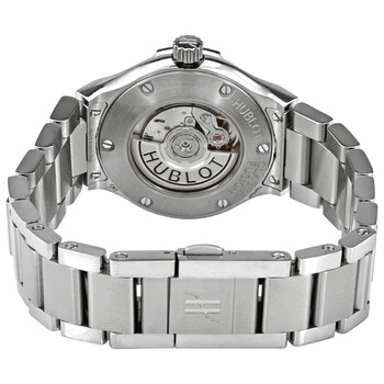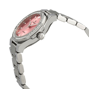 Grey titanium case with a grey titanium bracelet. Fixed grey titanium bezel set with diamonds. Pink dial with silver-tone hands and index hour markers. Dial Type: Analog. Date display at the 3 o'clock position. Hublot calibre HUB1120 automatic movement, containing 18 Jewels, composed of 65 parts, bitting at 28800 vph, and has a power reserve of approximately 40 hours. Scratch resistant sapphire crystal. Transparent case back. Round case shape. Case size: 33 mm. Fold over clasp with a safety release. Water resistant at 50 meters / 165 feet. Functions: date, hour, minute, second. Additional Info: bezel set with 36 diamonds for ~1.20.cts. Classic Fusion Series. Luxury watch style. Watch label: Swiss Made. Hublot Classic Fusion Automatic Diamond Pink Dial Ladies Watch 585.NX.891P.NX.1204.