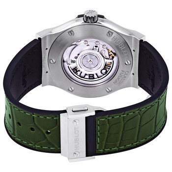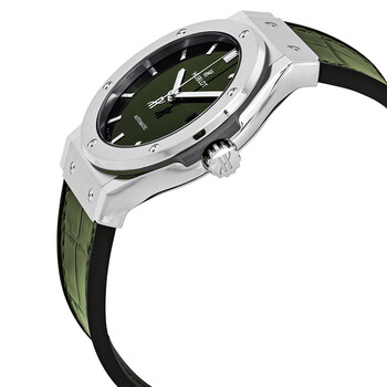 Satin-finished and polished titanium case with a black rubber strap with a green (alligator) leather top. Fixed polished titanium bezel. Black composite resin bezel lugs sandwiched between the bezel and case. Green sunray dial with silver-tone hands and index hour markers. Dial Type: Analog. Date display at the 3 o'clock position. Hublot calibre HUB1110 automatic movement, based upon Sellita SW300-1, containing 21 Jewels, composed of 63 parts, bitting at 28800 vph, and has a power reserve of approximately 42 hours. Scratch resistant sapphire crystal. Push / pull crown. Transparent case back. Round case shape, case size: 42 mm. Deployment clasp with a push button release. Water resistant at 50 meters / 165 feet. Functions: date, hour, minute, second. Classic Fusion Series. Luxury watch style. Watch label: Swiss Made. Hublot Classic Fusion Automatic Green Dial Men's Watch 542.NX.8970.LR.