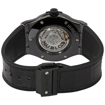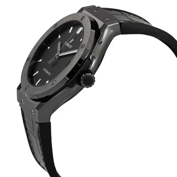 Black ceramic case with a black leather strap. Fixed black ceramic bezel. Black dial with silver-tone hands and index hour markers. Dial Type: Analog. Date display at the 3 o'clock position. Hublot calibre HUB1112 automatic movement, based upon Sellita SW300-1, containing 25 Jewels, composed of 63 parts, bitting at 28800 vph, and has a power reserve of approximately 42 hours. Scratch resistant sapphire crystal. Pull / push crown. Transparent case back. Round case shape. Case size: 45 mm. Fold over clasp. Water resistant at 50 meters / 165 feet. Functions: date, day, hour, minute, second. Classic Fusion Black Magic Series. Sport watch style. Watch label: Swiss Made. Hublot Classic Fusion Automatic Leather Black Dial Men's Watch 511.CM.1171.RX.