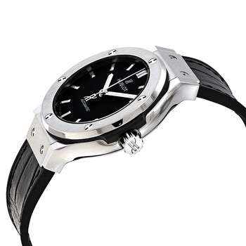 Grey titanium case with a rubber with a black (alligator) top strap. Fixed grey titanium bezel. Mat black dial with silver-tone hands and index hour markers. Dial Type: Analog. Date display at the 3 o'clock position. Hublot Calibre HUB1110 Automatic movement, based upon Sellita SW300-1, containing 21 Jewels, bitting at 28800 vph, and has a power reserve of approximately 42 hours. Scratch resistant sapphire crystal. Pull / push crown. Transparent case back. Round case shape. Case size: 38 mm. Deployment clasp. Water resistant at 50 meters / 165 feet. Functions: date, hour, minute, second. Luxury watch style. Watch label: Swiss Made. Hublot Classic Fusion Automatic Mat Black Dial Men's Watch 565.NX.1171.LR.