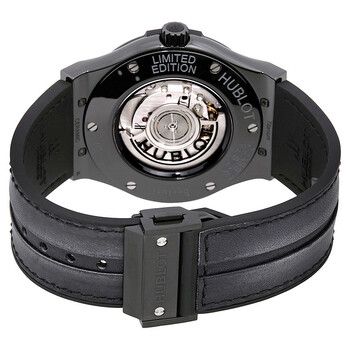 Black ceramic case with a black rubber and berluti patinated venezia leather strap. Black ceramic bezel. Black dial with black hands and index hour markers. Dial Type: Analog. Hublot Calibre HUB1100 automatic movement with a 42-hour power reserve. Scratch resistant sapphire crystal. Skeleton transparent exhibition see through case back. Case size: 45 mm. Round case shape. Deployant clasp. Water resistant at 50 meters / 165 feet. Functions: hour, minute, second. Additional Info: limited edition of 500 watches. Watch label: Swiss Made. Hublot Classic Fusion Automatic Men's Ceramic Watch 511.CM.0500.VR.BER16.
