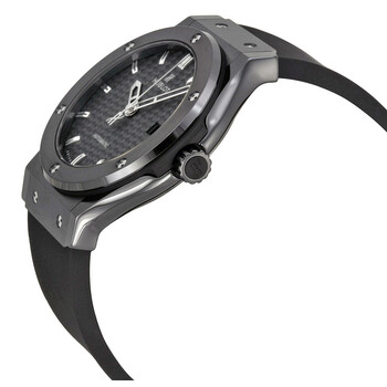 Black ceramic case with a black rubber strap. Fixed black ceramic bezel. Black carbon fiber dial with silver-tone hands and index hour markers. Dial Type: Analog. Date display at the 3 o'clock position. Automatic movement with a 42 hour power reserve. Scratch resistant sapphire crystal. Solid case back. Case diameter: 42 mm. Deployment clasp. Water resistant at 100 meters / 330 feet. Functions: hours, minutes, seconds, date. Luxury watch style. Hublot Classic Fusion Automatic Men's Watch 542.CM.1770.RX