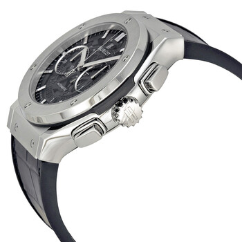 Grey satin-finish titanium case with a black rubber strap with a stiched black (alligator) leather top. Fixed grey titanium bezel. Black composite resin bezel lug sandwiched between the bezel and case. Skeleton dial with silver-tone hands and index hour markers. Minute markers around the outer rim. Dial Type: Analog. Date display at the 6 o'clock position. Chronograph - two sub-dials displaying: 60 second and 30 minute. Hublot calibre HUB1155 automatic movement, based upon ETA 2892, containing 60 Jewels, composed of 207 parts, bitting at 28800 vph, and has a power reserve of approximately 42 hours. Scratch resistant sapphire crystal. Screw down crown. Skeleton case back. Round case shape. Case size: 45 mm. Band width: 20.3 mm. Band length: 8 inches. Deployment clasp. Water resistant at 50 meters / 165 feet. Functions: chronograph, date, hour, minute, second. Classic Fusion Series. Luxury watch style. Watch label: Swiss Made. Item Variations: 525 NX 0170 LR, 525-NX-0170-LR, 525/NX/0170/LR, 525NX0170LR. Hublot Classic Fusion Automatic Skeleton Dial Men's Watch 525NX0170LR.