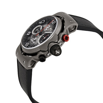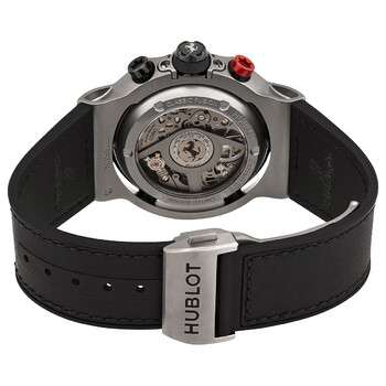 Titanium case with a black leather strap. Fixed titanium bezel. Black (skeleton center) dial with luminous black hands and alternating Arabic numeral and index hour markers. Minute markers around the outer rim. Dial Type: Analog. Date display at the 3 o'clock position. Chronograph - two sub-dials displaying: 60 minute and 60 second. Hublot calibre HUB1280 automatic movement, containing 43 Jewels, composed of 354 parts, bitting at 28800 vph, and has a power reserve of approximately 72 hours. Scratch resistant sapphire crystal. Transparent case back. Round case shape. Case size: 45 mm. Fold over clasp with a safety release. Water resistant at 100 meters / 330 feet. Functions: chronograph, column wheel, hour, minute, second. Additional Info: original box, manual (complete accessories). Classic Fusion Series. Luxury watch style. Watch label: Swiss Made. Hublot Classic Fusion Automatic Skeleton Dial Men's Watch 526.NX.0124.VR.
