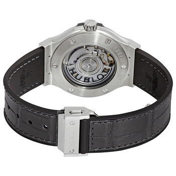 Grey titanium case with a grey (alligator) leather strap. Fixed grey titanium bezel. Black composite resin "bezel lug". Grey dial with silver-tone hands and index hour markers. Dial Type: Analog. Date display at the 3 o'clock position. Hublot calibre HUB1110 automatic movement, based upon Sellita SW300-1, containing 21 Jewels, composed of 63 parts, bitting at 28800 vph, and has a power reserve of approximately 42 hours. Scratch resistant sapphire crystal. Pull / push crown. Transparent case back. Round case shape. Case size: 38 mm. Fold over clasp. Water resistant at 50 meters / 165 feet. Functions: date, hour, minute, second. Classic Fusion Series. Dress watch style. Watch label: Swiss Made. Hublot Classic Fusion Automatic Titanium Men's Watch 565.NX.7071.LR.