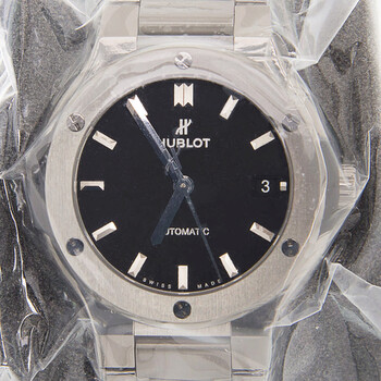 Grey titanium case with a silver-tone titanium bracelet. Fixed grey titanium bezel. Black dial with silver-tone hands and index hour markers. Dial Type: Analog. Date display at the 3 o'clock position. Hublot Caliber HUB1110 Automatic movement, based upon Sellita SW300-1, containing 25 Jewels, bitting at 28800 vph, and has a power reserve of approximately 42 hours. Scratch resistant sapphire crystal. Pull / push crown. Transparent case back. Round case shape, case size: 38 mm. Push button folding clasp. Water resistant at 50 meters / 165 feet. Functions: date, hour, minute, second. Classic Fusion Series. Luxury watch style. Watch label: Swiss Made. Hublot Classic Fusion Automatic Watch 568.NX.1170.NX.