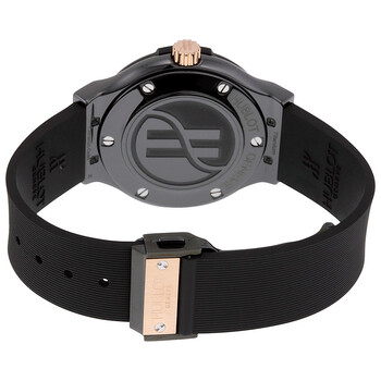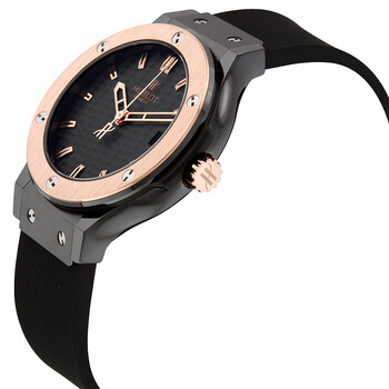 Black ceramic case with a black rubber strap. Fixed 18kt rose gold bezel. Black carbon dial with rose gold-tone skeleton hands and index hour markers. Dial Type: Analog. Date display at the 3 o'clock position. Quartz movement. Scratch resistant sapphire crystal. Solid case back. Case size: 38 mm. Round case shape. Deployment clasp with push button release. Water resistant at 100 meters / 330 feet. Functions: date, hour, minute, second. Additional Info: 18 carat rose gold bezel. Luxury watch style. Watch label: Swiss Made. Hublot Classic Fusion Black Carbon Dial Unisex Watch 561.CO.1780.RX.