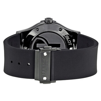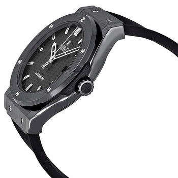Black ceramic case with a black rubber strap. Fixed black ceramic bezel. Black carbon fiber dial with silver-tone hands and index hour markers. Dial Type: Analog. Luminescent hands and markers. Date display at the 3 o'clock position. Automatic movement with a 42 hour power reserve. Scratch resistant sapphire crystal. Pull / push crown. Transparent case back. Case diameter: 45 mm. Round case shape. Deployment clasp. Water resistant at 100 meters / 330 feet. Functions: hours, minutes, date. Luxury watch style. Hublot Classic Fusion Black Carbon Fiber Dial Automatic Black Rubber Men's Watch 511.CM.1770.RX.