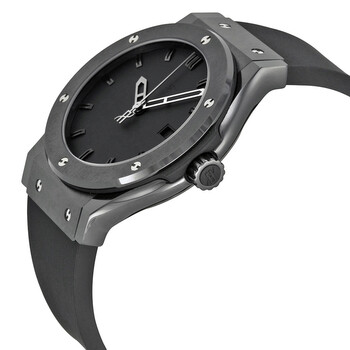 Ceramic and titanium case with a black rubber strap. Fixed bezel. Black dial with silver-toned hands and index hour markers. Dial Type: Analog. Date display at the 3 o'clock position. Automatic movement. Scratch resistant sapphire crystal. Case diameter: 42 mm. Round case shape. Deployment clasp. Functions: date, hour, minute, second. Luxury watch style. Hublot Classic Fusion Black Dial Automatic Men's Watch 542CM1110LR.