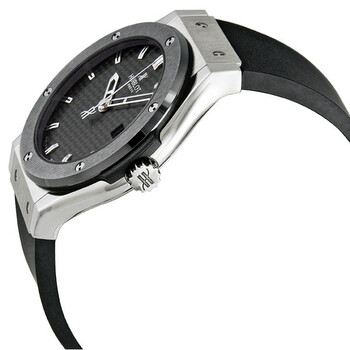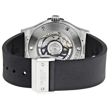 Zirconium case with a black rubber strap. Fixed bezel. Black dial with silver-tone hands and Arabic numeral hour markers. Dial Type: Analog. Date display at the 3 o'clock position. Automatic movement. Scratch resistant sapphire crystal. Screw down crown. Skeleton case back. Case diameter: 42 mm. Round case shape. Tang clasp. Water resistant at 100 meters / 330 feet. Functions: date, hour, minute, second. Casual watch style. Watch label: Swiss Made. Hublot Classic Fusion Black Dial Automatic Rubber Strap Men's Watch 542.ZM.1170.RX.
