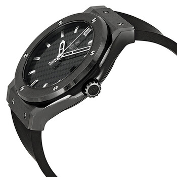 Black ceramic case with a black rubber strap. Fixed black ceramic bezel. Black carbon fiber dial with skeleton hands and index hour markers. Dial Type: Analog. Date display at the 3 o'clock position. Automatic movement. Scratch resistant sapphire crystal. Pull / push crown. Transparent case back. Case diameter: 45 mm. Round case shape. Deployant clasp. Water resistant at 100 meters / 330 feet. Functions: date, hour, minute, second. Luxury watch style. Watch label: Swiss Made. Hublot Classic Fusion Black Dial Ceramic Rubber Automatic Men's Watch 511CM1670RX.