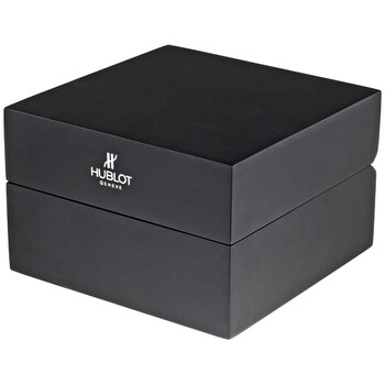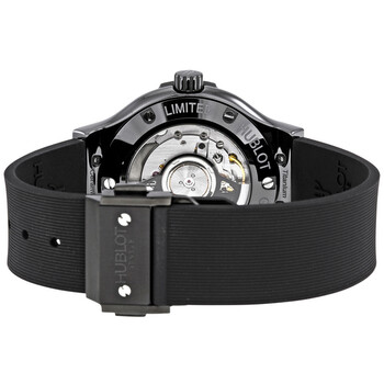 Black ceramic case with a black rubber strap. Fixed black ceramic bezel. Black dial with skeletal hands and index hour markers. Dial Type: Analog. Date display appears at the 3 o'clock position. Automatic movement. Scratch resistant sapphire crystal. Case diameter: 38 mm. Fold over clasp. Functions: hours, minutes, seconds, date. Luxury watch style. Hublot Classic Fusion Black Dial Men's Watch 565.CM.1110.RX.