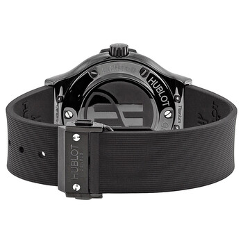 Black ceramic case with a black rubber strap. Fixed black ceramic bezel. Black dial with silver-tone skeleton hands and index hour markers. Dial Type: Analog. Date display at the 3 o'clock position. Quartz movement. Caliber hub 2910 engine. Scratch resistant sapphire crystal. Pull / push crown. Solid case back. Case diameter: 38 mm. Round case shape. Deployment with push button clasp. Water resistant at 100 meters / 330 feet. Functions: date, hour, minute, second. Casual watch style. Watch label: Swiss Made. Hublot Classic Fusion Black Dial Rubber Strap Men's Watch 561.CM.1110.RX.