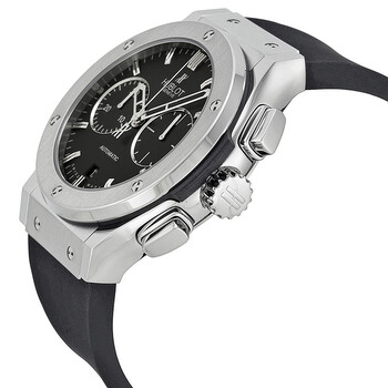 Titanium case with a black rubber strap. Fixed titanium bezel. Black dial with skeleton hands and index hour markers. Minute markers around the outer rim. Dial Type: Analog. Date display at the 6 o'clock position. Chronograph - two sub-dials displaying: 60 second and 30 minute. Automatic movement with 42 hour power reserve. Scratch resistant sapphire crystal. Pull / push crown. Transparent case back. Case diameter: 45 mm. Round case shape. Deployment clasp with push button release. Water resistant at 50 meters / 165 feet. Functions: date, hour, minute, second. Luxury watch style. Watch label: Swiss Made. Hublot Classic Fusion Black Dial Titanium BLack Rubber Men's Watch 521NX1170RX.
