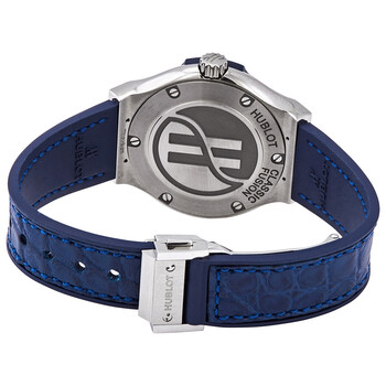 Grey titanium case with a blue rubber strap with a blue (alligator) leather top. Fixed grey titanium bezel. Blue composite resin bezel lug sandwiched between the bezel and case. Blue dial with silver-tone hands and index hour markers. Dial Type: Analog. Date display at the 3 o'clock position. Hublot calibre HUB2912 quartz movement. Scratch resistant sapphire crystal. Pull / push crown. Solid case back. Round case shape, case size: 33 mm. Deployment clasp with a push button release. Water resistant at 50 meters / 165 feet. Functions: date, hour, minute, second. Classic Fusion Series. Dress watch style. Watch label: Swiss Made. Item Variations: 581 NX 7170 LR, 581-NX-7170-LR, 581/NX/7170/LR, 581NX7170LR. Hublot Classic Fusion Blue Dial Blue Leather Ladies Watch 581.NX.7170.LR.