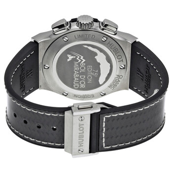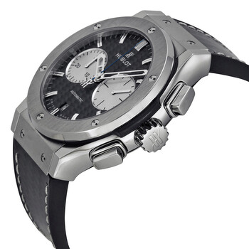 Titanium case with a black rubber and carbon fiber strap. Fixed titanium bezel. Black carbon fiber dial with blue and silver-tone hands and index hour markers. Minute markers around the outer rim. Dial Type: Analog. Date display at the 6 o'clock position. Chronograph - two sub-dials displaying: 60 second and 30 minute. Automatic movement. HUB1143 engine. Scratch resistant anti-reflective sapphire crystal. Case diameter: 45 mm. Round case shape. Deployment clasp. Water resistant at 50 meters / 165 feet. Functions: chronograph, date, hour, minute, second. Luxury watch style. Watch label: Swiss Made. Hublot Classic Fusion Bol dOr Mirabaud Black Dial Men's Watch 521NX.1717QRBOM13.