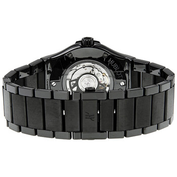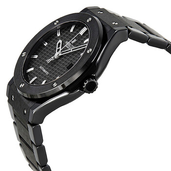 Black ceramic case with a black ceramic bracelet. Fixed bezel. Black carbon fiber dial with silver-toned hands and index hour markers. Dial Type: Analog. Date display at the 3 o'clock position. Automatic movement. Scratch resistant sapphire crystal. Skeleton case back. Case diameter: 45 mm. Round case shape. Deployment clasp. Water resistant at 50 meters / 165 feet. Functions: date, hour, minute, second. Luxury watch style. Watch label: Swiss Made. Hublot Classic Fusion Carbon Fiber Dial Black Ceramic Men's Watch 511CM1770CM.