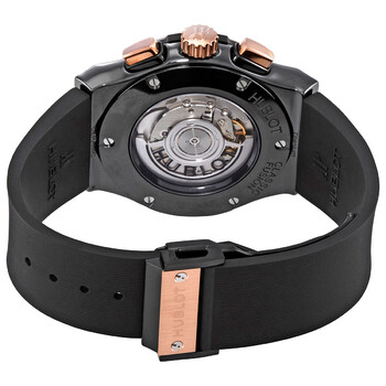 Polished black ceramic case with a black (lined) rubber strap. Fixed 18kt rose gold bezel with 6 polished "h" style titanium screws. Black dial with rose gold hands and index hour markers. Minute markers around the outer rim. Dial Type: Analog. Date display at the 6 o'clock position. Chronograph - two sub-dials displaying: 60 second and 30 minute. Hublot calibre HUB1143 automatic movement, based upon ETA 2892-A2, containing 59 Jewels, bitting at 28800 vph, and has a power reserve of approximately 42 hours. Scratch resistant sapphire crystal. Pull / push crown. Transparent see through case back. Round case shape. Case size: 45 mm. 18kt king gold and black stainless steel deployant clasp. Water resistant at 50 meters / 165 feet. Functions: chronograph, date, hour, minute, second. Classic Fusion Series. Luxury watch style. Watch label: Swiss Made. Hublot Classic Fusion Chronograph Automatic Black Dial Men's Watch 521.CO.1181.RX.