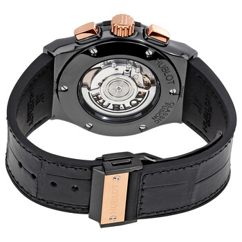 Black ceramic and titanium case with a black leather strap. Fixed 18kt rose gold bezel. Black carbon fiber dial with rose gold-tone hands and index hour markers. Minute markers around the outer rim. Dial Type: Analog. Date display at the 6 o'clock position. Chronograph - two sub-dials displaying: 60 second and 30 minute. Hublot Calibre HUB1143 Automatic movement, based upon ETA 2892-A2, containing 59 Jewels, bitting at 28800 vph, and has a power reserve of approximately 42 hours. Scratch resistant sapphire crystal. Pull / push crown. Transparent case back. Round case shape, case size: 45 mm. Deployment clasp. Water resistant at 50 meters / 165 feet. Functions: chronograph, date, hour, minute, second. Classic Fusion Series. Luxury watch style. Watch label: Swiss Made. Hublot Classic Fusion Chronograph Automatic Men's Watch 521.CO.1781.LR.