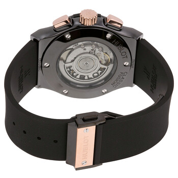 Black ceramic case with a black rubber strap. Fixed 18kt rose gold bezel. Black carbon fiber dial with rose gold-tone hands and index hour markers. Minute markers around the outer rim. Dial Type: Analog. Date display at the 6 o'clock position. Chronograph - two sub-dials displaying: 60 second and 30 minute. Hublot Calibre HUB1143 Automatic movement, based upon ETA 2892-A2, containing 59 Jewels, bitting at 28800 vph, and has a power reserve of approximately 42 hours. Scratch resistant sapphire crystal. Pull / push crown. Transparent case back. Round case shape, case size: 45 mm. Fold over with push button release clasp. Water resistant at 50 meters / 165 feet. Functions: chronograph, date, hour, minute, second. Classic Fusion Series. Luxury watch style. Watch label: Swiss Made. Hublot Classic Fusion Chronograph Automatic Men's Watch 521CO1781RX.