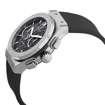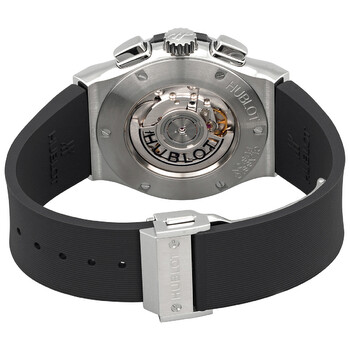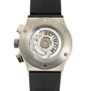 Grey titanium case with a black rubber strap. Fixed grey titanium bezel. Transparent dial with silver-tone hands and index hour markers. Minute markers around the outer rim. Dial Type: Analog. Chronograph - two sub-dials displaying: 60 second and 30 minute. Hublot Calibre HUB1155 Automatic movement, based upon ETA 2892, containing 60 Jewels, composed of 207 parts, bitting at 28800 vph, and has a power reserve of approximately 42 hours. Scratch resistant sapphire crystal. Transparent see through case back. Round case shape, case size: 45 mm. Deployment with push button release clasp. Water resistant at 50 meters / 165 feet. Functions: chronograph, date, hour, minute, second. Additional Info: original box, international warranty card, manual (complete accessories). Classic Fusion Series. Luxury watch style. Watch label: Swiss Made. Hublot Classic Fusion Chronograph Automatic Men's Watch 525.NX.0170.RX.