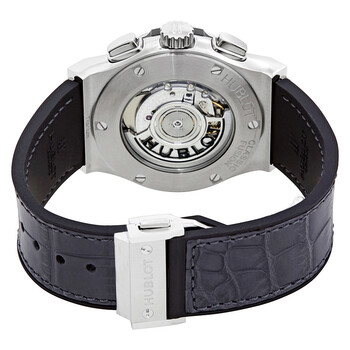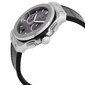 Titanium case with a grey (alligator) leather strap. Fixed titanium bezel. Grey dial with silver-tone hands and index hour markers. Minute markers around the outer rim. Dial Type: Analog. Date display at the 6 o'clock position. Chronograph - two sub-dials displaying: 60 second and 30 minute. Hublot calibre HUB1153 automatic movement with a 42-hour power reserve. Scratch resistant sapphire crystal. Transparent case back. Round case shape. Case size: 42 mm. Push button fold over clasp. Water resistant at 50 meters / 165 feet. Functions: chronograph, date, hour, minute, second. Luxury watch style. Watch label: Swiss Made. Hublot Classic Fusion Chronograph Automatic Men's Watch 541.NX.7070.LR.