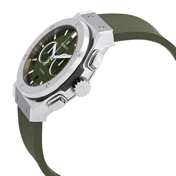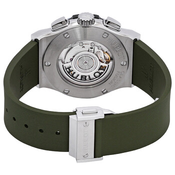 Titanium case with a green rubber strap. Fixed titanium bezel. Green dial with index hour markers. Dial Type: Analog. Date display at the 6 o'clock position. Chronograph - two sub-dials displaying: 60 second and 30 minute. Hublot Calibre HUB1153 Automatic movement, containing 35 Jewels, composed of 155 parts, bitting at 28800 vph, and has a power reserve of approximately 42 hours. Scratch resistant sapphire crystal. Screw down crown. Solid case back. Round case shape, case size: 42 mm. Deployment clasp. Water resistant at 50 meters / 165 feet. Functions: chronograph, date, hour, minute, second. Classic Fusion Series. Luxury watch style. Watch label: Swiss Made. Hublot Classic Fusion Chronograph Titanium Automatic Green Dial Men's Watch.