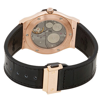 18kt rose gold case with a black (alligator) leather strap (rubber backed). Fixed 18kt rose gold bezel. Black dial with rose gold-tone hands and index hour markers. Dial Type: Analog. Seconds sub-dial at the 7 o'clock position. Hublot calibre HUB1300 hand wind movement with a 90-hour power reserve. Scratch resistant sapphire crystal. Pull / push crown. Transparent case back. Round case shape. Case size: 42 mm. Fold over clasp with a push button release. Water resistant at 50 meters / 165 feet. Functions: hour, minute, second. Luxury watch style. Watch label: Swiss Made. Item Variations: 545 OX 1280 LR, 545-OX-1280-LR, 545/OX/1280/LR, 545OX1280LR. Hublot Classic Fusion Classico Ultra Thin18k Rose Gold Hand Wound 42mm Men's Watch 545.OX.1280.LR.