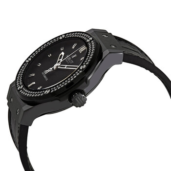 Black ceramic case with a black rubber strap with a black (alligator) leather top. Fixed black PVD bezel with a black ceramic inlay and set with 126 diamonds. Matte black dial with silver-tone skeleton hands and index hour markers. Dial Type: Analog. Date display at the 3 o'clock position. Hublot calibre HUB1110 automatic movement, based upon Sellita SW300-1, containing 21 Jewels, composed of 63 parts, bitting at 28800 vph, and has a power reserve of approximately 42 hours. Scratch resistant sapphire crystal. Pull / push crown. Transparent case back. Round case shape. Case size: 38 mm. Deployment clasp with a push button release. Water resistant at 50 meters / 165 feet. Functions: date, hour, minute, second. Classic Fusion Series. Luxury watch style. Watch label: Swiss Made. Item Variations: 565 CM 1170 LR 1104, 565-CM-1170-LR-1104, 565/CM/1170/LR/1104, 565CM1170LR1104. Hublot Classic Fusion Men's Luxury Automatic Diamond Bezel Watch 565.CM.1170.LR.1104.