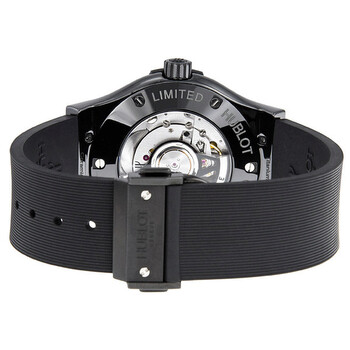 Black ceramic case with a lack rubber strap. Fixed bezel. Black dial with black hands and index hour markers. Minute markers around the outer rim. Dial Type: Analog. Date display at the 3 o'clock position. Automatic movement. Scratch resistant hardlex crystal. Case diameter: 42 mm. Round case shape. Deployment with push button clasp. Hublot Classic Fusion Men's Watch 542.CM.1110.RX.