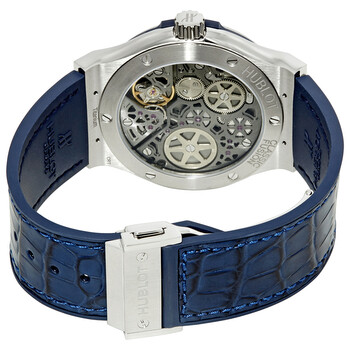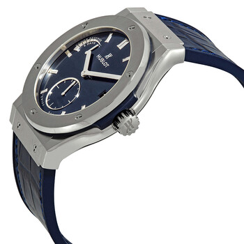 Titanium case with a blue (alligator) leather strap. Fixed titanium bezel. Blue dial with silver-tone hands and index hour markers. Dial Type: Analog. Date display at the 3 o'clock position. Two- small seconds, and power reserve subdials. Hublot calibre HUB1601 hand wind movement with a 192-hour power reserve. Scratch resistant sapphire crystal. Pull / push crown. Transparent case back. Round case shape. Case size: 45 mm. Fold over clasp with a push button release. Water resistant at 50 meters / 165 feet. Functions: date, hour, minute, second, power reserve indicator. Additional Info: suitable for very light splashing; unsuitable for rain, showering, swimming or diving. Luxury watch style. Watch label: Swiss Made. Hublot Classic Fusion Power Reserve 8 Days Titanium 45mm Men's Watch 516.NX.7170.LR.