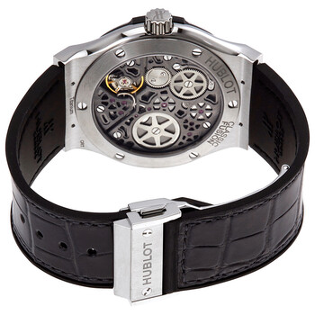 Titanium case with a grey leather (rubber backed) strap. Fixed titanium bezel. Grey dial with grey hands and index hour markers. Dial Type: Analog. Date display at the 3 o'clock position. Two displays showing: small seconds and power reserve. Hublot calibre HUB1601 hand wind movement with a 192-hour power reserve. Scratch resistant sapphire crystal. Screw down crown. Transparent case back. Round case shape. Case size: 45 mm. Case thickness: 10 mm. Push button fold over clasp. Water resistant at 50 meters / 165 feet. Functions: date, hour, minute, second, power reserve indicator. Luxury watch style. Watch label: Swiss Made. Hublot Classic Fusion Power Reserve Men's Watch 516.NX.7070.LR.