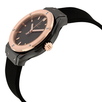 Black ceramic case with a black rubber strap. Fixed rose gold-plated titanium bezel. Black dial with rose rhodium-plated hands and index hour markers. Dial Type: Analog. Date display at the 3 o'clock position. Hublot Calibre HUB2912 quartz movement. Scratch resistant sapphire crystal. Pull / push crown. Solid case back. Round case shape. Case size: 33 mm. Fold over with push button release clasp. Water resistant at 50 meters / 165 feet. Functions: date, hour, minute, second. Luxury watch style. Watch label: Swiss Made. Hublot Classic Fusion Quartz Black Dial Ladies Watch 581.CO.1781.RX.