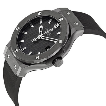 Polished and satin-finish black ceramic case with a rubber strap. Fixed black ceramic bezel. Black dial with index hour markers. Dial Type: Analog. Luminescent markers. Date display at the 3 o'clock position. Hublot Calibre HUB2910 quartz movement. Scratch resistant anti-reflective sapphire crystal. Pull / push crown. Solid case back. Round case shape. Case size: 38 mm. Deployment clasp. Water resistant at 100 meters / 330 feet. Functions: date, hour, minute, second. Luxury watch style. Watch label: Swiss Made. Hublot Classic Fusion Quartz Black Dial Men's Watch 561.CM.1770.Rx.