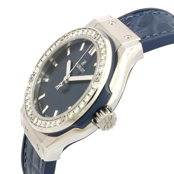 Titanium case with a blue alligator leather and rubber strap. Fixed bezel. Blue dial with silver-tone hands and index hour markers. Dial Type: Analog. Date display at the 3 o'clock position. Hublot Calibre HUB2912 quartz movement. Scratch resistant sapphire crystal. Pull / push crown. Solid case back. Round case shape, case size: 33 mm. Folding clasp. Water resistant at 50 meters / 150 feet. Functions: date, hour, minute, second. Additional Info: bezel set with 36 diamonds (0.75 carats). Classic Fusion Series. Luxury watch style. Watch label: Swiss Made. Hublot Classic Fusion Quartz Blue Dial Ladies Watch 581.NX.7170.LR.1104.