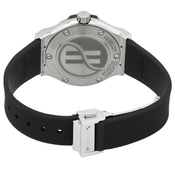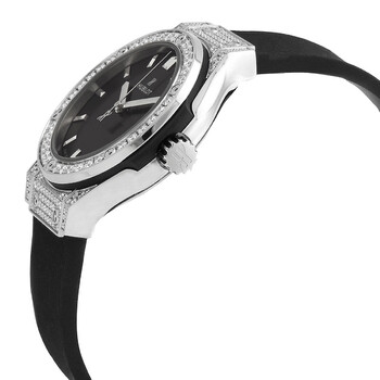 Titanium case set with 114 diamonds totaling 0.6ct with a black rubber strap. Fixed titanium bezel set with 36 diamonds for 0.8ct with 6 h-shaped titanium screws. Black sunray dial with silver-tone hands and index hour markers. Dial Type: Analog. Date display at the 3 o'clock position. Hublot Calibre HUB2912 quartz movement. Scratch resistant sapphire crystal. Solid case back. Round case shape, case size: 33 mm. Deployant buckle clasp. Water resistant at 50 meters / 165 feet. Functions: date, hour, minute, second. Classic Fusion Series. Luxury watch style. Watch label: Swiss Made. Hublot Classic Fusion Quartz Diamond Black Dial Ladies Watch 581.NX.1470.RX.1704.