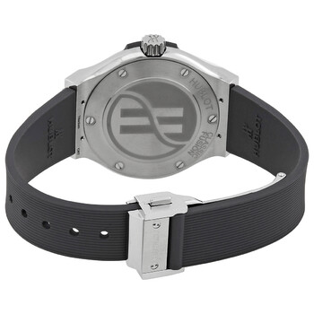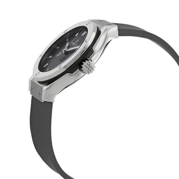 Grey titanium case with a grey rubber strap. Fixed grey titanium bezel. Grey dial with silver-tone hands and index hour markers. Dial Type: Analog. Date display at the 3 o'clock position. Hublot Calibre HUB2912 quartz movement. Scratch resistant sapphire crystal. Transparent see through case back. Round case shape, case size: 33 mm. Deployment with push button release clasp. Water resistant at 50 meters / 165 feet. Functions: date, hour, minute, second. Additional Info: original box, manual (complete accessories). Classic Fusion Series. Luxury watch style. Watch label: Swiss Made. Hublot Classic Fusion Quartz Grey Dial Ladies Watch 581.NX.7071.RX.