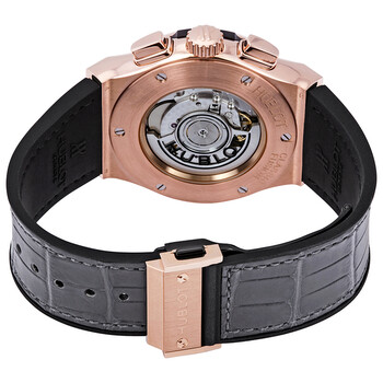 18k king gold case with a grey leather (inner rubber) strap. Fixed 18k king gold bezel. Grey sunray dial with rose gold hands and index hour markers. Dial Type: Analog. Date display at the 6 o'clock position. Chronograph - two sub-dials displaying: 60 second and 30 minute. Hublot Calibre HUB1143 automatic movement with a 42-hour power reserve. Scratch resistant sapphire crystal. Round case shape. Case size: 45 mm. Deployant clasp. Water resistant at 50 meters / 165 feet. Functions: chronograph, date, hour, minute, second. Luxury watch style. Watch label: Swiss Made. Item Variations: 521 OX 7080 LR, 521-OX-7080-LR, 521/OX/7080/LR, 521OX7080LR. Hublot Classic Fusion Racing Grey Dial Automatic Men's Chronograph 18K King Gold Watch 521.OX.7080.LR.