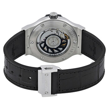 Titanium case with a black alligator leather strap. Fixed bezel. Silver dial with silver-toned hands and index hour markers. Dial Type: Analog. Date display at the 3 o'clock position. Automatic movement. Scratch resistant sapphire crystal. Case diameter: 38 mm. Round case shape. Push button foldover clasp. Water resistant at 50 meters / 165 feet. Functions: date, hour, minute, second. Luxury watch style. Watch label: Swiss Made. Hublot Classic Fusion Silver Dial Automatic Men's Watch 565NX2610LR.