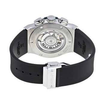 Polished and satin-finished titanium case with a black rubber strap. Vertical satin-finished titanium bezel with 6 h-shaped titanium screws. Silver dial with skeleton hands and index hour markers. Minute markers around the outer rim. Dial Type: Analog. Date display at the 6 o'clock position. Chronograph - two sub-dials displaying: 60 second and 30 minute. Automatic movement with a 42 hour power reserve. Scratch resistant sapphire crystal. Skeleton case back. Case diameter: 45 mm. Round case shape. Deployment clasp. Water resistant at 50 meters / 165 feet. Functions: chronograph, date, hour, minute, second. Luxury watch style. Watch label: Swiss Made. Hublot Classic Fusion Silver Dial Chronograph Black Rubber Men's Watch 521.NX.2610.RX.
